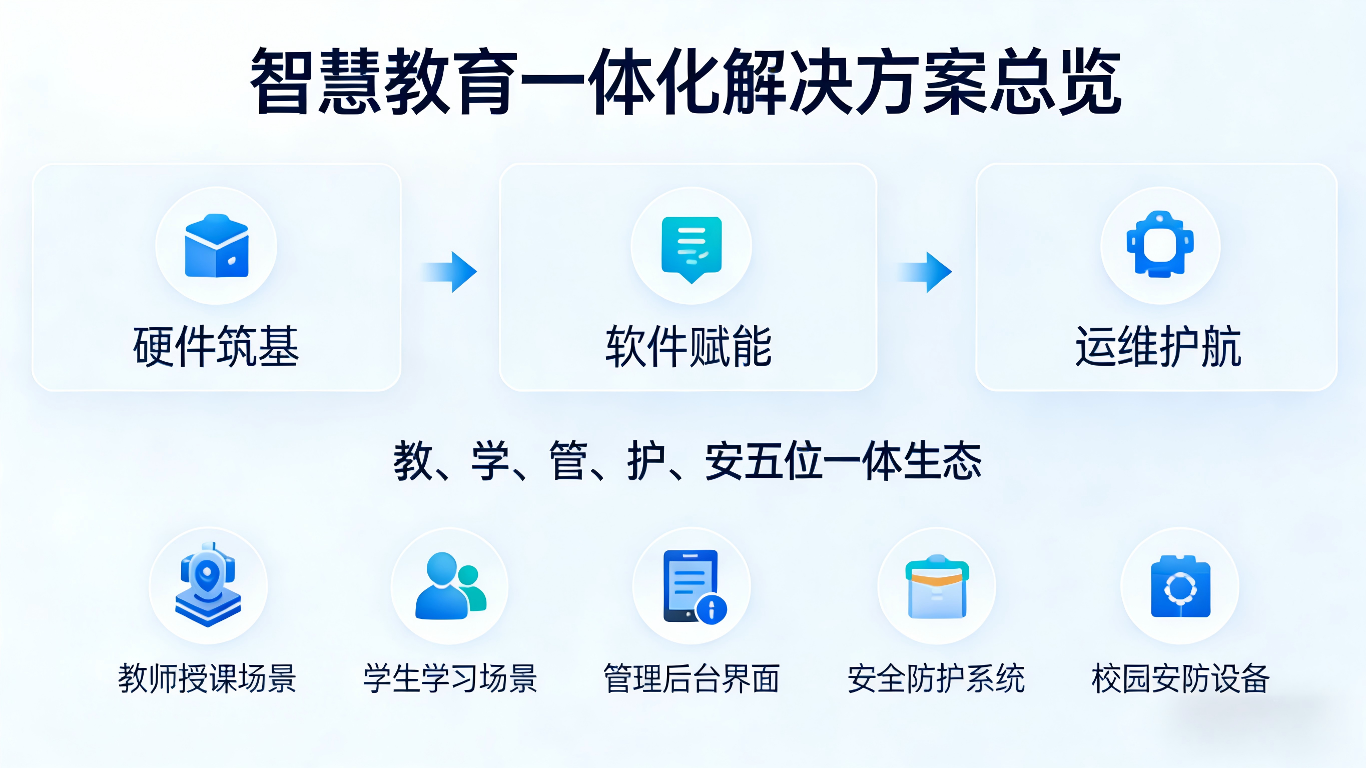 作为弱电工程领域的专业服务商,我们立足教育数字化转型需求,融合多年弱电系统全流程经验,打造“硬件筑基、软件赋能、运维护航”的一体化智慧教育解决方案。方案以“提质增效、减负赋能”为核心,覆盖四大核心板块,适配全学段,助力教育机构实现从“传统校园”向“智慧校园”高效转型。